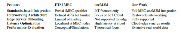 Figure 1 Comparison of ETSI MEC, oneM2M, and Our Work.